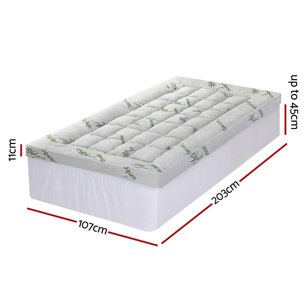 Elevate your sleep with the Giselle Bedding Pillowtop Topper, featuring an 11cm plush profile of 1500GSM hollow fiber beneath premium bamboo fabric. The 3D wave-check quilting enhances airflow while distributing weight evenly across your mattress. Designed for deep mattresses up to 45cm, this highly breathable topper arrives vacuum-packed for hygiene and is machine-washable for effortless maintenance.