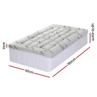 Elevate your sleep with the Giselle Bedding Pillowtop Topper, featuring an 11cm plush profile of 1500GSM hollow fiber beneath premium bamboo fabric. The 3D wave-check quilting enhances airflow while distributing weight evenly across your mattress. Designed for deep mattresses up to 45cm, this highly breathable topper arrives vacuum-packed for hygiene and is machine-washable for effortless maintenance.