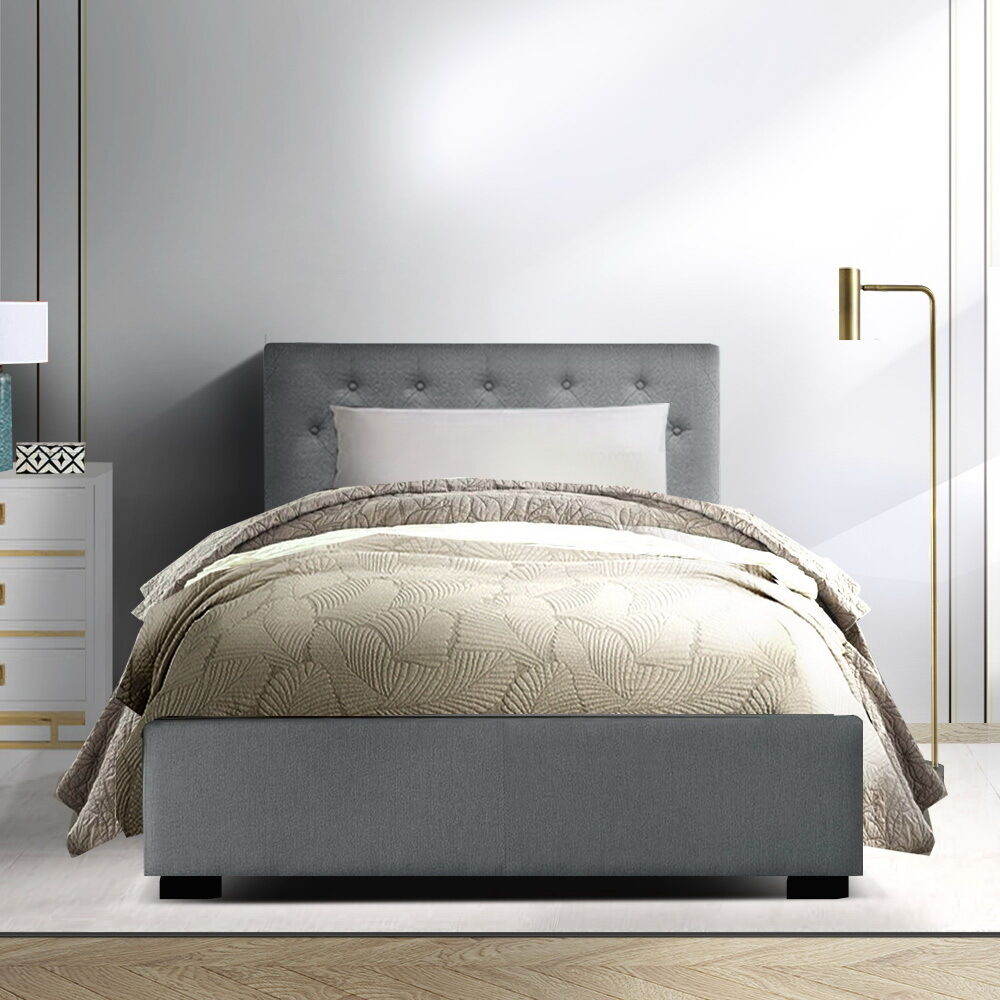 $238.07From the outside, our contemporary Artiss Vila Gas Lift Bed Frame looks absolutely plush. The premium linen fabric tufted headboard and sides all exudes fine craftsmanship. But there’s more to this luxurious bed frame than meets the eye. Lift up the frame and you will find acres of storage space under the wooden arched slat base. The gas lift system certainly helps to free up existing space in your storage cabinets for other household things.The wooden arched slat base is also designed to flex appropriately so that it can better distribute the weight exerted on it. As such, it helps to minimize movement disturbances created when two persons are sleeping on the bed. Overall, the bed frame is well-built with reinforced steel bars within its sturdy steel frame. Heavy-duty metal connectors keeps the frame sturdy with additional central support from an adjustable centre support beam. Enjoy your wonderful sleep in more ways than one with our innovative Artiss Vila Gas Lift Bed Frame.