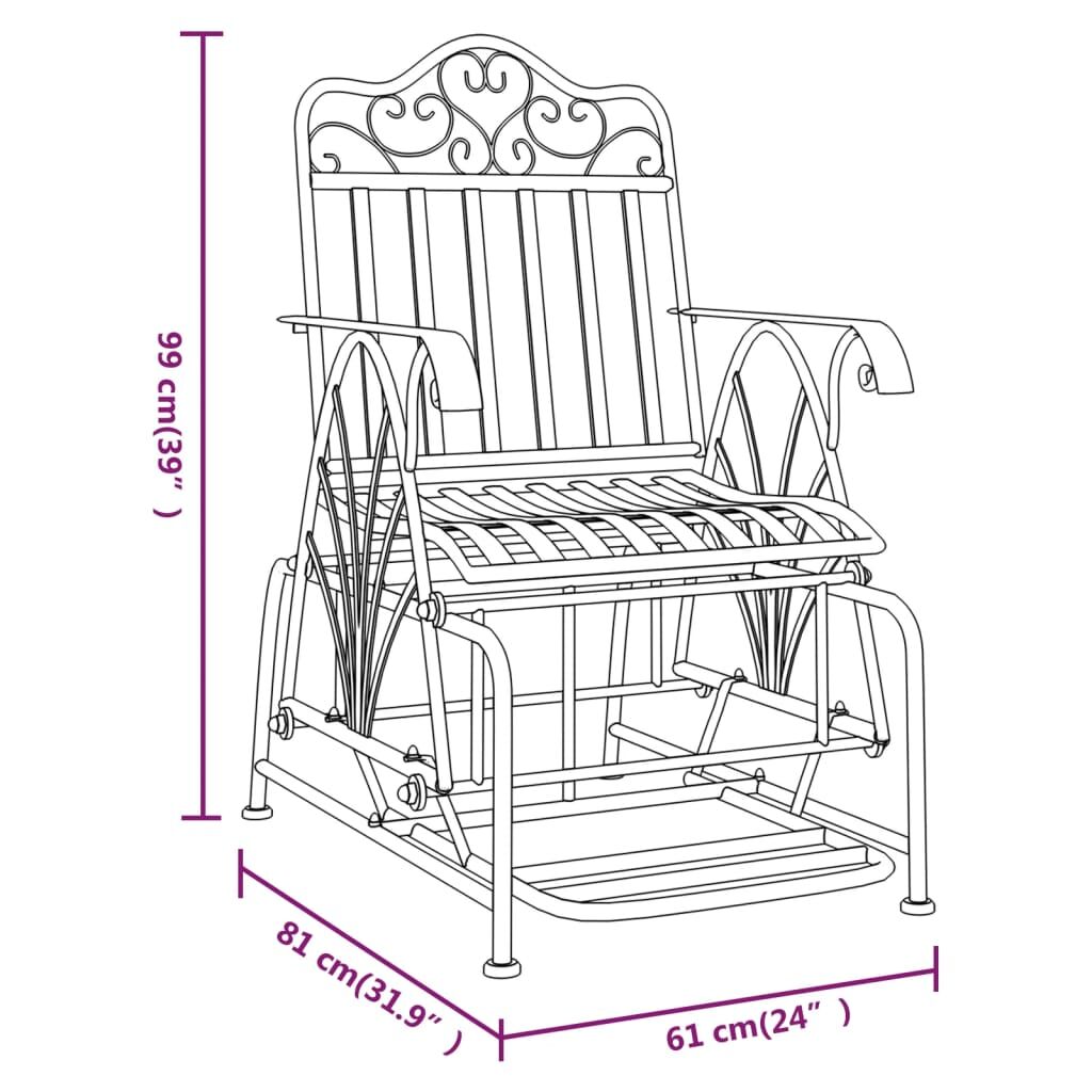 $193.79Relax by rocking your day and enjoying your leisure time on this metal glider bench! Rocking function: This chair allows you to rock back and forth on the rocking mechanism. You will enjoy a calming, gentle rocking motion.Premium material: This bench seat is made of steel, weather-resistant and highly durable, making it perfectly suitable for daily outdoor use.Comfortable seating experience: The broad, high-back support and seat paired with armrests give you a comfortable feel while sitting down.Stylish look: The decorative patterns and elegant design of this patio bench will surely spruce up your seating area. Note:In order to extend the life of your outdoor furniture, we recommend you to clean it regularly and do not leave it outdoors without protection unnecessarily.Clean: Use a mild soap solution.Storing: If possible, store in a cool, dry place indoors. If the product is stored outdoors, protect it with a waterproof cover. Wipe and dry the excess water or snow from flat surfaces after a rain or snowfall. Allow sufficient air circulation to avoid moisture-related damage.