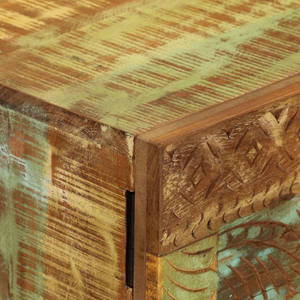 $343.89This wooden sideboard has a distinctive design and will add a touch of retro style to your interior. Solid reclaimed wood: Solid reclaimed wood consists of reused timbers such as teak, mango wood, pinewood, and beech. These materials are recycled from old buildings such as factories, sheds, and boats. As every piece is handmade, colours will vary for each product.Practical design: The sideboard cabinet has compartments which provide ample storage space for keeping books, or glassware, etc. organised, while the sturdy top is ideal for displaying decorative items, like vases, photo albums, fruit baskets, etc.Retro style: This colourful side cabinet with antique hand carved pattern brings the luxury of mid-century inspired design to your interior, being the focal point of your room. Note: The colours may vary from piece to piece, making each piece unique and slightly different from the next. The delivery is random, ensuring the exclusivity and individuality of your product.Warning:To prevent it being overturned, this product must be used with the provided wall attachment device.