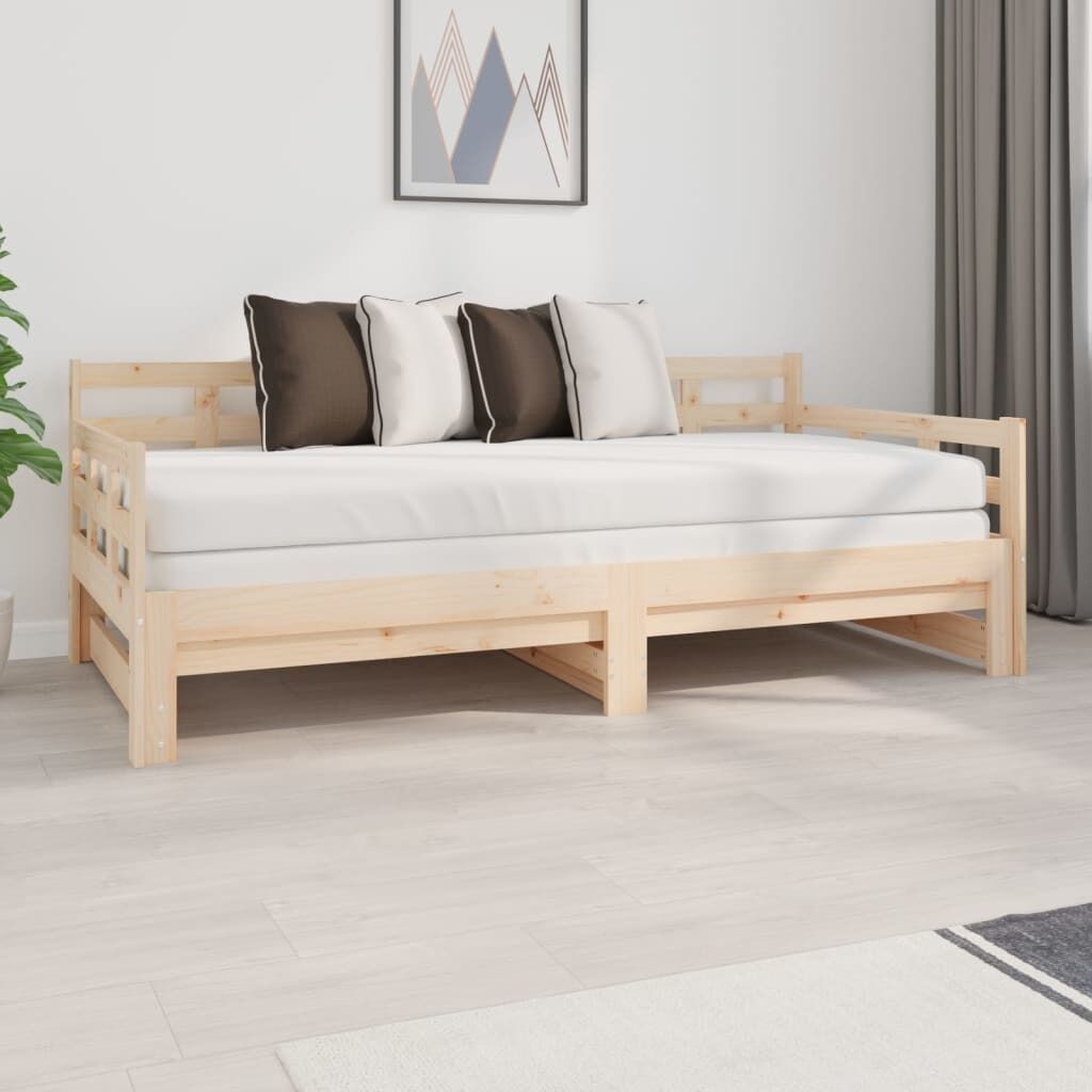 $251.09In addition to serving as a sofa during the day, this multifunctional day bed also serves as a bed at night, making it an excellent choice for overnight guests. No matter where it is placed, this practical sofa bed is sure to catch the eye! Solid pine wood: Solid pine wood is a beautiful natural material. Pine wood has a straight grain, and the knots give the material its signature, rustic look.Convertible design: With a pull-out trundle bed, the wooden day bed can easily be converted into a couch during the day and a comfortable bed at night.Space-saving function: This solid wood day bed maximises the available floor space while providing sleeping space for two people, making it an ideal choice for people with limited living space. Note:The delivery includes a daybed frame only. The mattress is not included. You can check our shop for the matching mattresses.Each product comes with an assembly manual in the box for easy assembly.