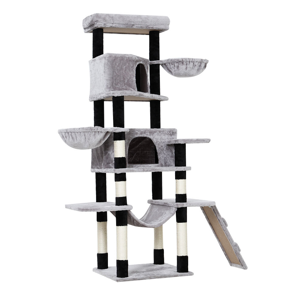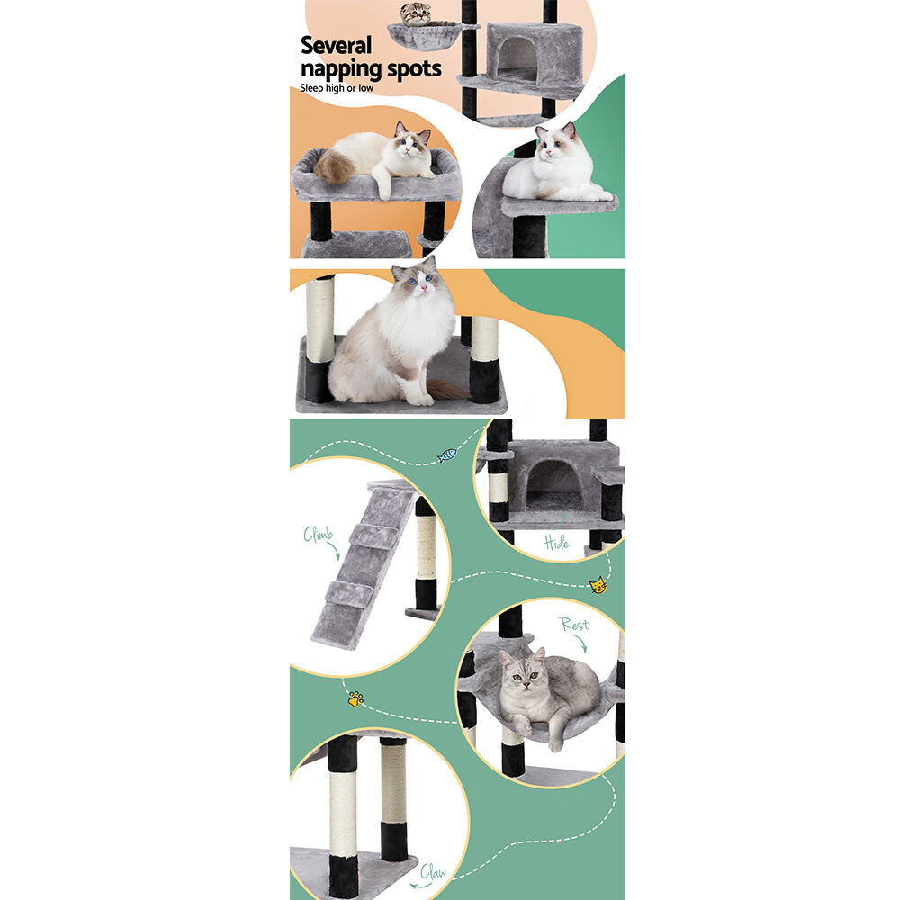 A purrfect way to keep your cats entertained! Our i.Pet Fela large-sized cat trees cater to your feline friend's scratching instinct and playtime and provide enough space to relax and nap. It's absolutely a feline wonderland. Our cat trees feature bed cubicles, side sleeping hammocks, cradle, ladder, and platforms for tom and tabby to have hours of fun scratching, hunting, climbing, jumping, hopping, and playing with favourites or simply lounging around. Additionally, with its sisal-covered scratching posts, you can rest assured that your furniture will stay scratch-free. It also has comfortable velvet upholstered surfaces, ideal for napping after a long playtime. For your peace of mind, our cat trees boast a firm base and sturdy wood construction. This ensures good stability and durability. With so many playing and napping spots, our Fela cat tree is just right for your cat to have its energetic exploration.