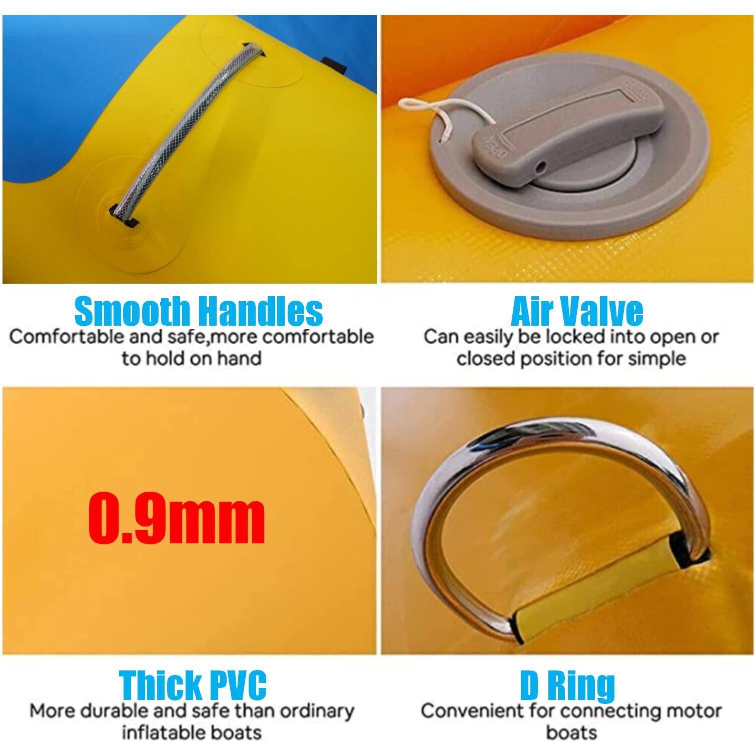 [TOWABLE AND COMFORTABLE]: The head of water towing boat has strong stainless steel D-rings for rope connection. The sturdy handle gives you strong support and makes it easier to climb in the water. With 2 wide main center tubes for comfortable seating and both sides to improve balance and stability also can act as footrests.