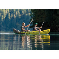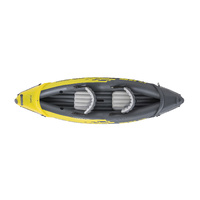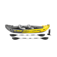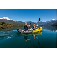 The Intex Explorer K2 Kayak is sporty and fun with a streamlined design for easy paddling. The bright yellow color and sporty graphics makes the kayak highly visible in the water. Great for experiencing lakes and mild rivers with a friend, this Sports Series kayak is perfect for two adults. Lightweight and compact, this kayak is a snap to assemble, and allows you to take the fun of kayaking wherever you go. Made with rugged vinyl construction, this sturdy kayak has an inflatable I-beam floor for comfort and rigidity. A removable skeg provides directional stability, while two adjustable, inflatable seats with backrests are included for comfort. Quick inflating or deflating is a breeze with a Boston valve on each side. A grab line and grab handle at each end is provided for your convenience, as well as a U.S. Coast Guard I.D., and a repair patch kit. The Explorer K2 Kayak provides added accessories including: two 86in aluminum oars and an Intex high-output pump for easy inflation and deflation.