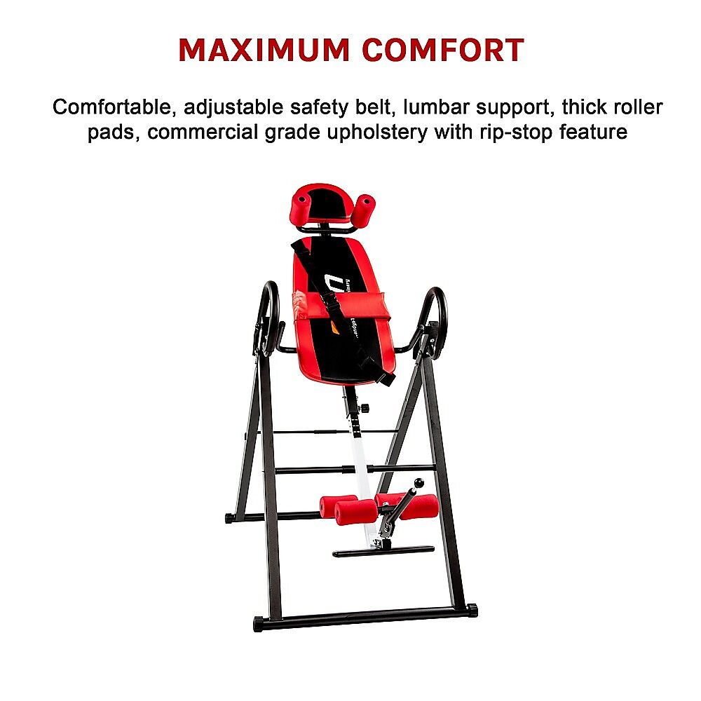 Constructed with rust-proof powder-coated steel, this table can support people weighing up to 150 kilogrammes. It's height-adjustable, so it can accommodate a wide range of users. After you're done, just fold it up and store it until the next time you need it. Don't suffer a day longer with back pain. Order your inversion table today.