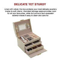 Lined with velvet, this box protects your most delicate jewellery inside its soft interior. Abundant storage space provides room for all your favourites, while its luxurious faux snakeskin exterior makes it easy to clean and care for. Delicate yet sturdy gold-tone knobs allow you to open each compartment easily.