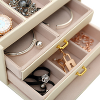 The first drawer has no dividers so it can accommodate even your largest jewellery. Divided into two sections, the second drawer helps you organise your jewellery by category so you can find what you need easily. The bottom drawer, like the first, is undivided, providing excellent storage space for your larger pieces.