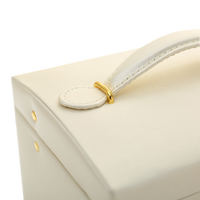 The lid opens to reveal a mirror and two snap-on straps to organise pieces that might otherwise get tangled. The top compartment features cushioned pillows designed for rings, earrings, and other small items, as well as a small box to hold your tiniest jewels.