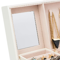 A small pop-up compartment with removable earring stands gives you flexibility--use it for your earrings or remove the stands to store other small pieces. On the second level, six compartments and soft, pillowy ring rolls provides room for even a huge jewellery collection. Underneath, a drawer with removable dividers gives you a wide range of storage options.
