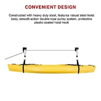 $63.89This would save you much space to store your kayak! Simply hang your kayak on the ceiling by pulling one wire. Thanks to convenient pulley system design, simply use the wire the control the kayak up and down. It is so simple even your teenagers can do that. Simple is beauty. You can also use it to hang your bike. This hoist is rated for up to 45kg, and our tests confirmed that it can carry up to 60kg!