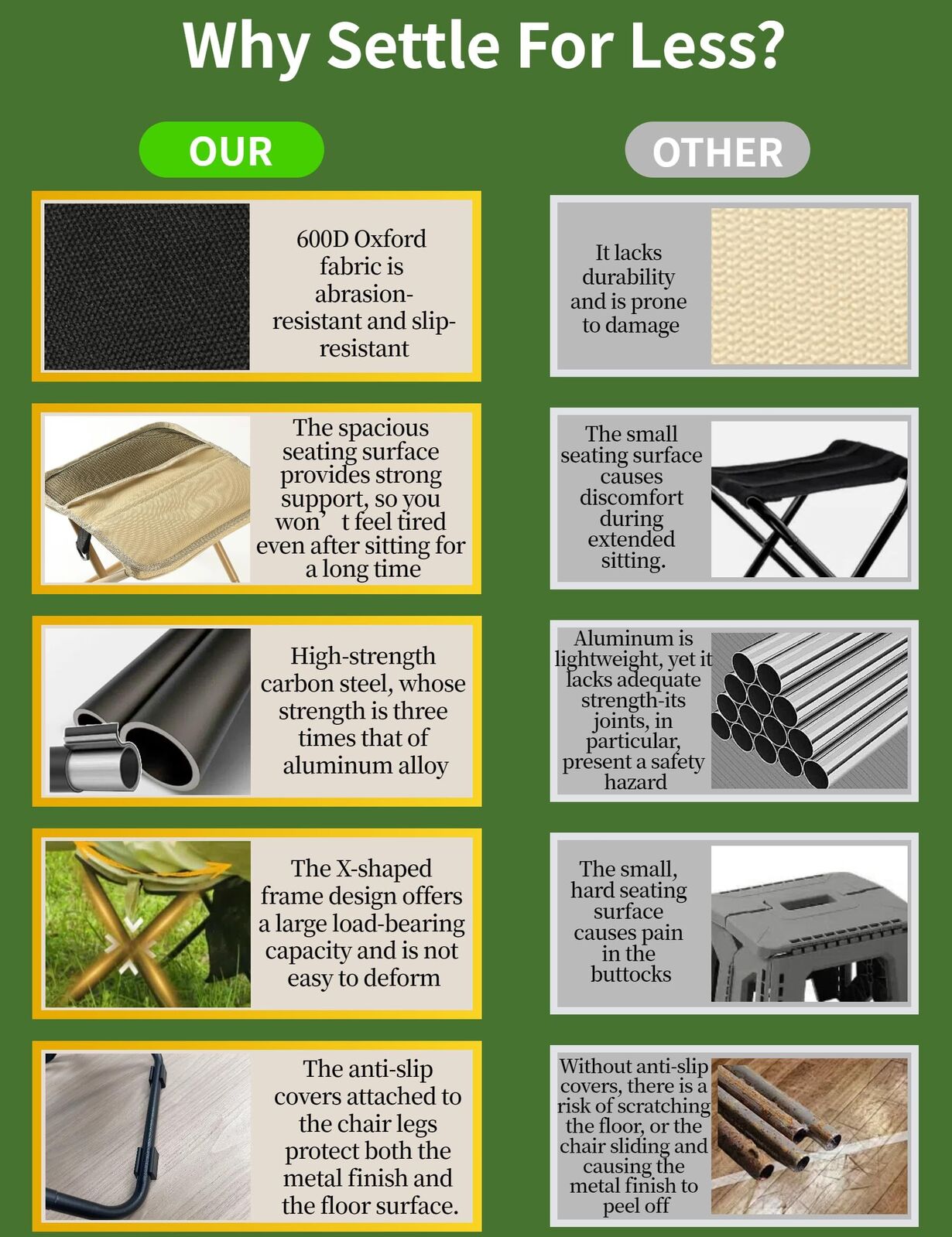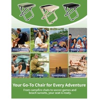 With a maximum load capacity of 270 lbs (122 kg), its strong enough for adults yet compact enough for kids to carry. Its X-shaped frame ensures balance and prevents wobbling, while anti-slip foot pads protect floors and prevent sliding. Perfect for camping, hiking, fishing, tailgating, beach outings, or simply resting during long walks.