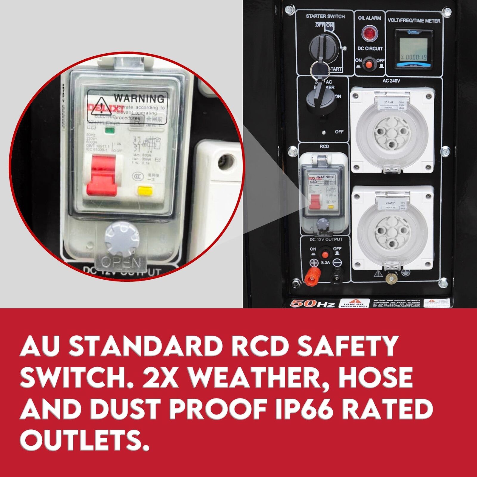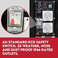 Featuring 2x heavy-duty IP66 rated 15A and 20A 240V power outlets, plus an 8.3amp 12 volt DC outlet - it could comfortably run a whole range of tools, white goods and lighting. Adding to its commercial application, it features an RCD safety switch for additional OHS assurance. The unit’s user-friendly design is facilitated by its electric key start, overload protection, low oil indicator and multifunctional LCD monitor.