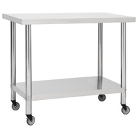 $180.37This work table is perfect for food preparation and service in a kitchen, restaurant, school and commercial space. This gastronomy worktable is made of stainless steel, durable for lifetime use. The smooth surface is corrosion-resistant and easy to clean. The bottom board offers extra storage space. The workbench features 4 moveable wheels so that you can move it around freely. In addition, 2 wheels have brakes to keep the table in place.