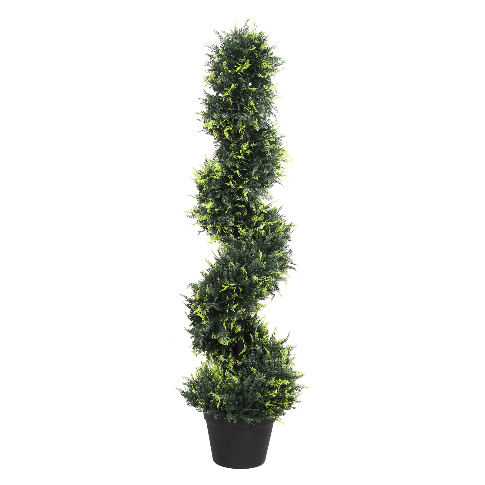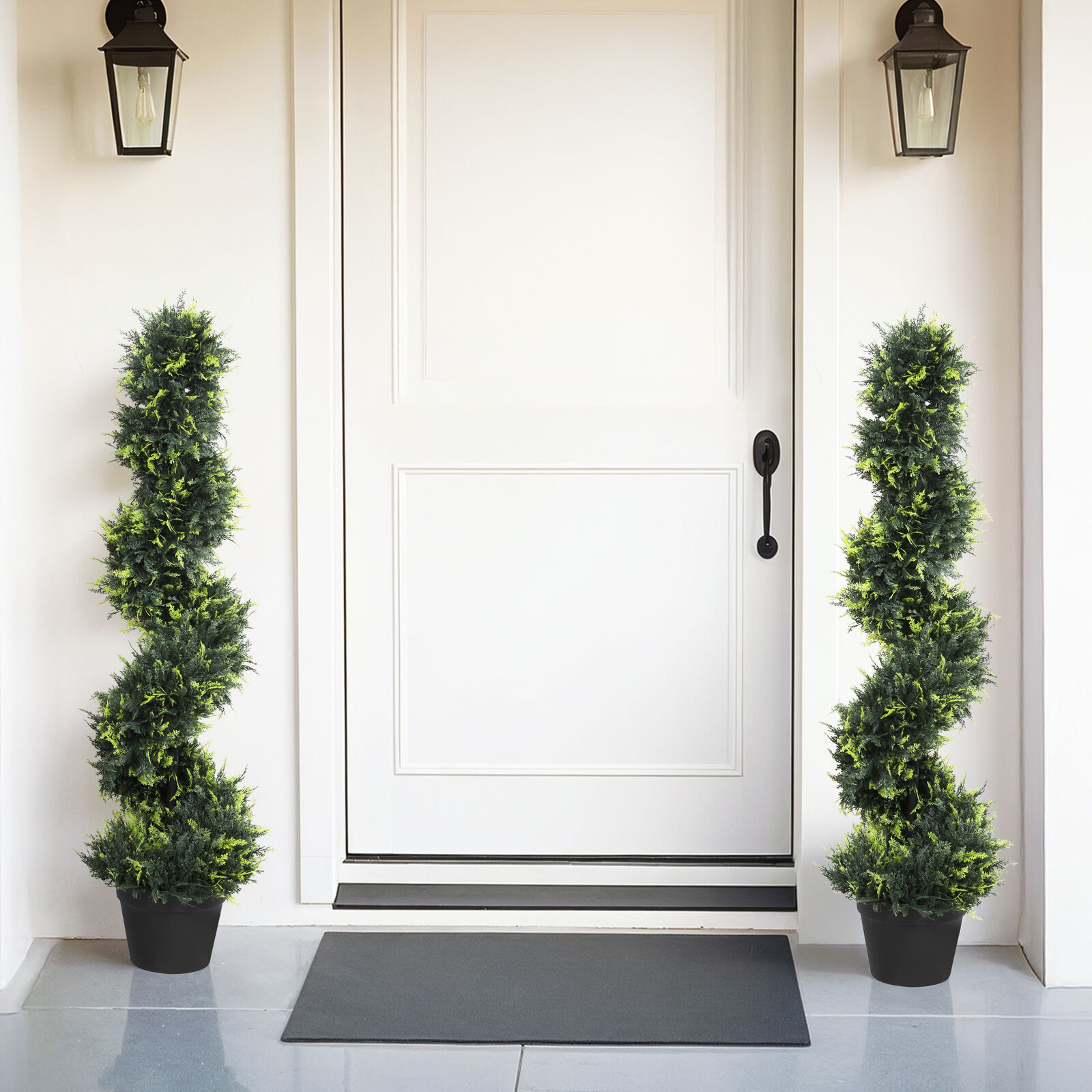 Still battling with dead plants? These two round artificial cedar trees offer a distinctive solution with their unique spiral shape. Featuring lifelike cedar foliage with soft, deep green needles and a striking gradient green that adds depth and natural variation, they deliver a remarkably realistic look. Constructed with durable branches and high-quality PE leaves, these trees are UV-resistant, colorfast, and waterproof, making them ideal for both indoor and outdoor settings. The robust cement pots ensure excellent stability, while the spiral design introduces an elegant and unique touch to your decor. Effortless to maintain, these faux cedar trees require no installation, watering, trimming, or sunlight, combining convenience with standout style.