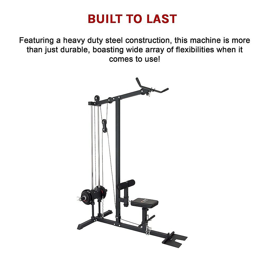 This new Fitness Plate Loaded Low Row / Lat Pull has a heavy duty steel construction. The solid unit has a dual guide rod system which provides the ultimate in safe, smooth and easy range of motion. The foot plate can be quickly flipped up in place for low rows. Lat Pull Down, Straight Row Bar and Standard and Olympic Weight Plate Adapters are included. Its no cable change design allows for easy adjustment from lat pull down to low rows.