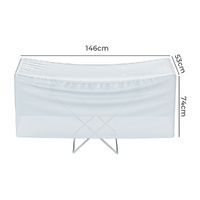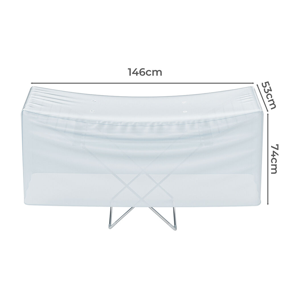 The dimensions of the clothes drying rack are 147cm (L) x 54cm (W) x 94cm (H), and the cover's dimensions are 147cm (L) x 54cm (W) x 74cm (H). When not in use, it can be folded up, significantly saving space in your living area.