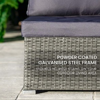 The set includes ultra-comfy 10cm thick water-resistant seat cushions, generous backrest cushioning and two throw cushions. The high-quality UV-resistant handwoven Suntech wicker in Marl Grey weave has a premium natural textured look. This is a modular design comprising 1 sofa, two corner sofas, plus a coffee table with tempered glass table top. You can set it up in whatever configuration works best for you, making this London Rattan outdoor lounge setting a great addition to any outdoor space.