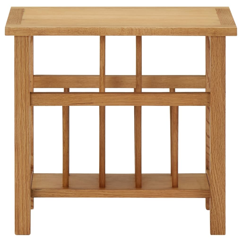 Our magazine table features a simple yet stylish design and adds a touch of rustic charm to your home decor. This magazine rack has been expertly crafted from solid oak wood and MDF, making it durable and functional. Thanks to its compact design, the table takes up very little space and is easy to move around. The sturdy tabletop is ideal for displaying decorative objects, photo frames, or potted plants. It also has one shelf, which is perfect for keeping newspapers and magazines.