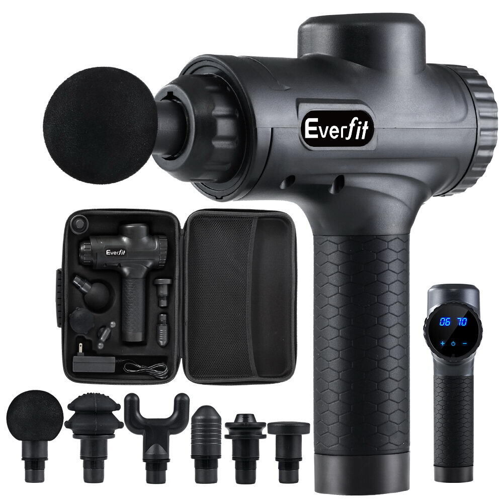 $68.81Chronic muscle pains? Hardcore gym junkie? Office job with long working hours? Recovering from an accident? Whatever your situation, our Everfit Percussion Massage Gun provides customised percussive relief in the comfort of your own home, without the need to visit luxury spas. The powerful 20V brushless high-torque motor with closed-loop control operates quietly and provides rapid bursts of pressure penetrating 12mm deep into your muscle tissues at up to 4000 percussions per minute. The massage gun is powered by a rechargeable lithium battery that lasts up to 8 hours so that you can forget to recharge once in a while and the non-slip rubber handle provides a comfortable grip to reduce hand fatigue. Percussion speed can be easily adjusted using the intuitive LCD display with smart touch controls and there are 30 speed levels to suit various purposes from simply waking up your muscles to relieving lactic acid and assisting muscle recovery after exercising, or even intense professional-level massages. And with the six interchangeable head attachments for targeted relief (round, fork, bullet, flat, Pneumatic and conical heads), you are ensured of a fully customised massage.
