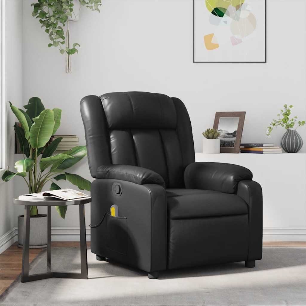 $284.39Sit back and drift away in this highly comfortable massage recliner chair! Manual reclining function: This reclining chair has a handle on the right side. You can manually adjust the footrest and the backrest to any position as per your comfort with a simple pull of the handle. This feature allows for a maximum tilt of 135 degrees. Additionally, the backrest can go quickly back to the original place with an easy pull of the handle.Vibration function: The featured 6 massage points let you experience a better-targeted massage. Additionally, the included hand control allows you to pick different massage programs. The massage function is powered by the USB connector, but the certified 5V USB power source is not included.Comfortable seat experience: The thickly padded seat, backrest, and wide armrests covered in faux leather provide a cosy sensation, making you feel embraced while seated. The faux leather is a highly durable material. It is resistant to stain, making it easy to clean with a damp cloth. The smooth surface also gives a luxurious look and the beauty of real leather.Convenient side pocket: This armchair has a side pocket for your remote control or keeping your essential items within easy reach.Solid and stable frame: The frame made of wood and metal provides a strong structure and stability. This reclining armchair is comfortable and durable.