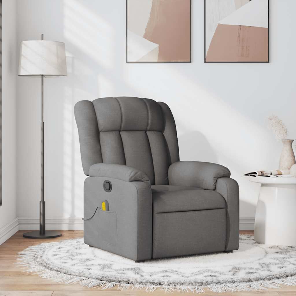 $316.79Sit back and drift away in this highly comfortable massage recliner chair! Manual reclining function: This reclining chair has a handle on the right side. You can manually adjust the footrest and the backrest to any position as per your comfort with a simple pull of the handle. This feature allows for a maximum tilt of 135 degrees. Additionally, the backrest can go quickly back to the original place with an easy pull of the handle.Vibration function: The featured 6 massage points let you experience a better-targeted massage. Additionally, the included hand control allows you to pick different massage programs. The massage function is powered by the USB connector, but the certified 5V USB power source is not included.Comfortable seat experience: The thickly padded seat, backrest, and wide armrests covered in fabric provide a cosy and warm sensation, making you feel embraced while seated. The fabric features a simple and clean look and is breathable and durable.Convenient side pocket: This armchair has a side pocket for your remote control or keeping your essential items within easy reach.Solid and stable frame: The frame made of wood and metal provides a strong structure and stability. This reclining armchair is comfortable and durable.