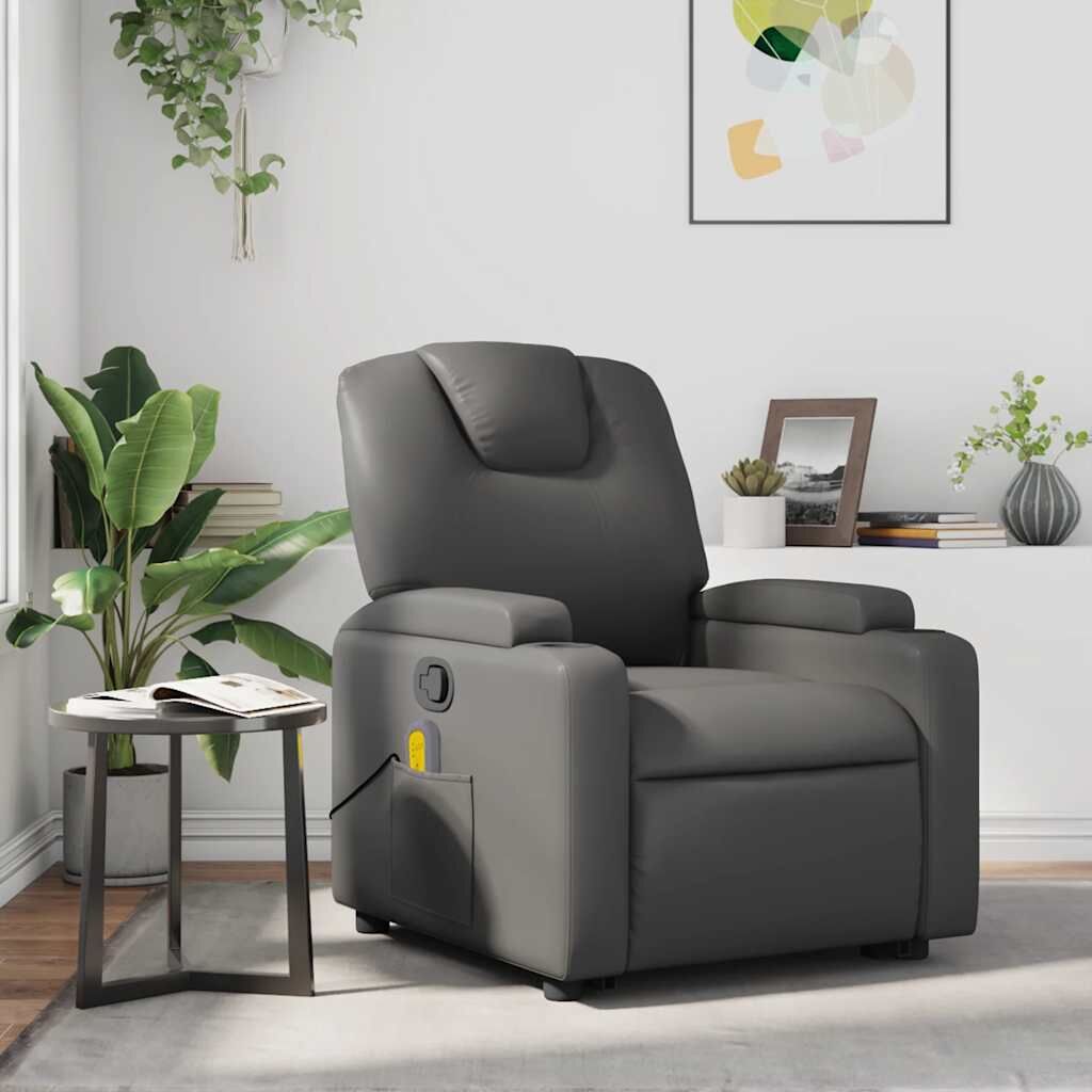 $306.89Sit back and drift away in this highly comfortable massage recliner chair! Manual reclining function: This reclining chair has a handle on the right side. You can manually adjust the footrest and the backrest to any position as per your comfort with a simple pull of the handle. This feature allows for a maximum tilt of 135 degrees. Additionally, the backrest can go quickly back to the original place with an easy pull of the handle.Vibration function: The featured 6 massage points let you experience a better-targeted massage. Additionally, the included hand control allows you to pick different massage programs. The massage function is powered by the USB connector, but the certified 5V USB power source is not included.Comfortable seat experience: The thickly padded seat, backrest, and wide armrests covered in faux leather provide a cosy sensation, making you feel embraced while seated. The faux leather is a highly durable material. It is resistant to stain, making it easy to clean with a damp cloth. The smooth surface also gives a luxurious look and the beauty of real leather.Convenient cup holders and side pocket: This armchair has two convenient cup holders for your drinks and a side pocket for your remote control or keeping your essential items within easy reach.Solid and stable frame: The frame made of wood and metal provides a strong structure and stability. This reclining armchair is comfortable and durable.