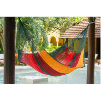 Outdoor cotton hammocks are built for heavy use or play in the great outdoors. They're pet and child friendly and are more weather resistant than our traditional cotton hammocks; the cotton string is 3 to 4 times thicker. Hanging these hammocks undercover will ensure a long life. If hung outside just unhook them when not in use, easy to do with our Tree Straps.