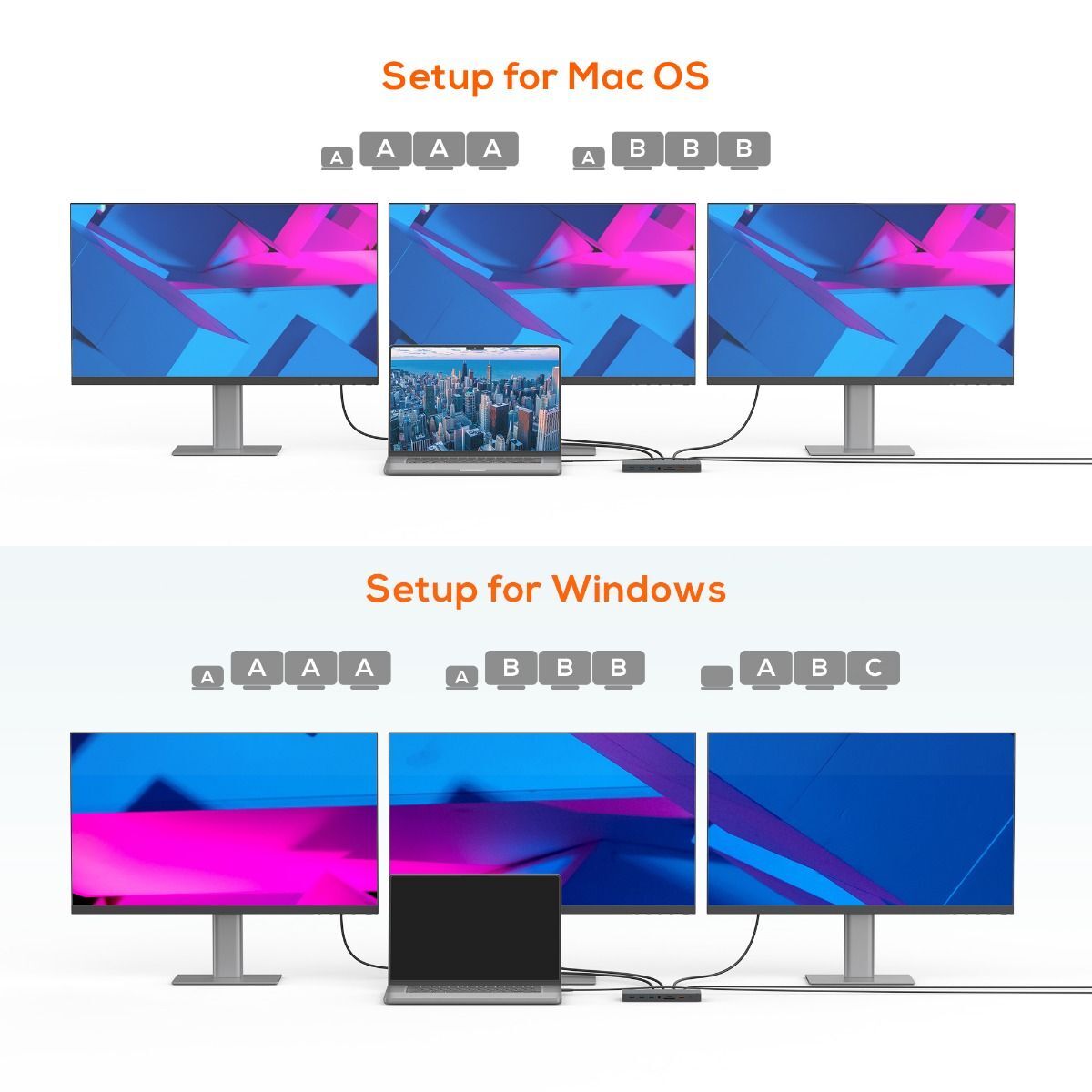 Windows OS supports MST, Mac OS only supports SST in USB-C Display Alt mode, MacBook (2020) with M1 CPU currently only supports 1 external monitor display.
