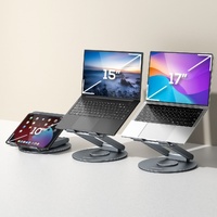 A universal laptop stand with a rotating base and height adjustment to provide an elevated view of your laptop screen, designed to minimise fatigue and reduce strain on neck and eyes while working and studying.
