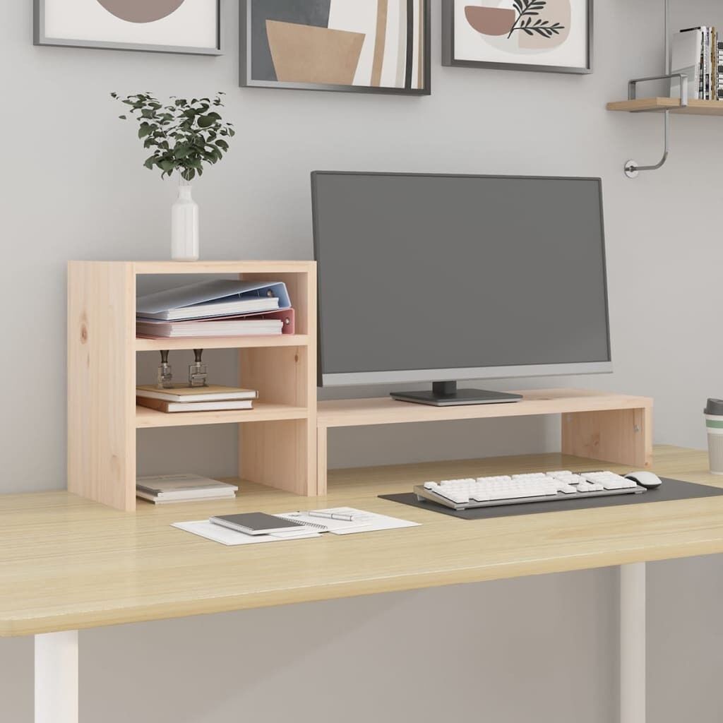 $40.84This classic wooden monitor stand featuring a minimalist design adds a beautiful touch to your current living space. Solid pinewood: Solid pine wood is a beautiful natural material. Pine wood has a straight grain, and the knots give the material its signature, rustic look.Stable frame: The wooden frame of this computer stand ensures sturdiness and stability.Storage space: The space under the computer monitor stand can accommodate your keyboard, DVD player, gaming console, streaming device, receivers, media carriers, notebooks, pens, and similar items. There are also additional shelves for storage.Stress-reducing function: This keyboard stand can be used as a riser for your desktop monitor and other multimedia devices. Raising your screen will reduce the strain on your neck and back. Note:Each product comes with an assembly manual in the box for easy assembly.