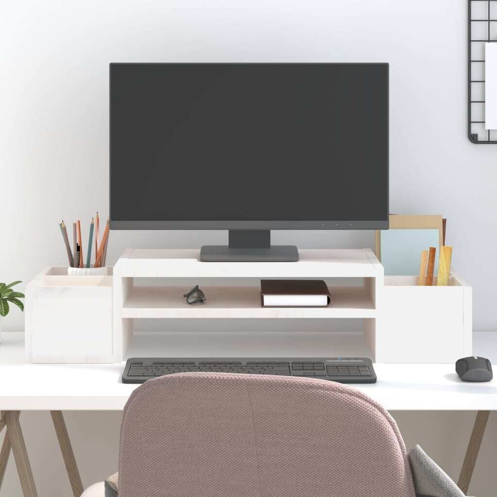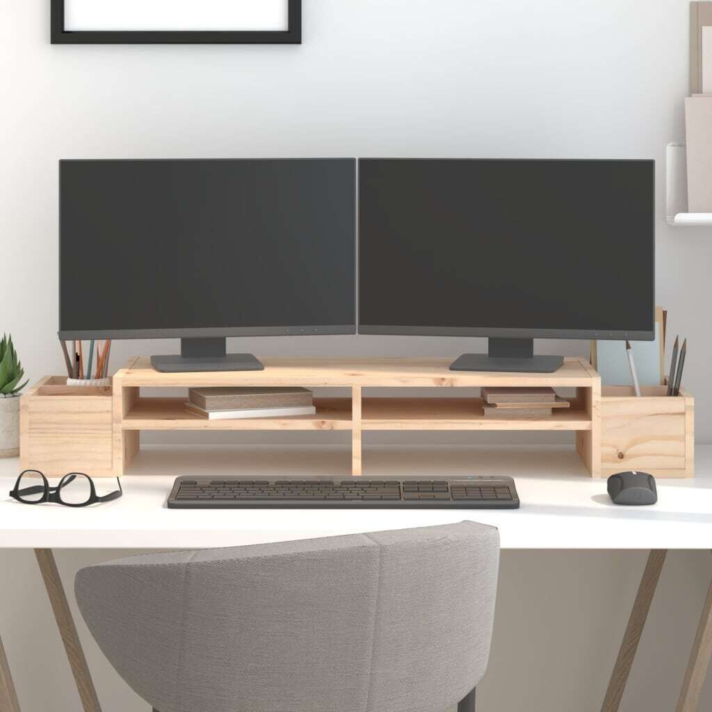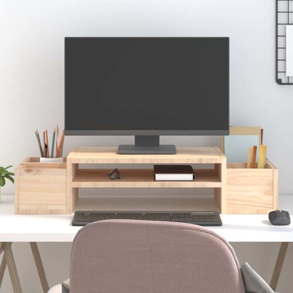 $44.64This classic wooden monitor stand featuring a minimalist design adds a beautiful touch to your current living space. Solid pinewood: Solid pine wood is a beautiful natural material. Pine wood has a straight grain, and the knots give the material its signature, rustic look.Stable frame: The wooden frame of this computer stand ensures sturdiness and stability.Storage space: The 4 storage slots on the side of the computer monitor stand and the space underneath the monitor riser allow you to store keyboard, DVD player, gaming console, receivers, media carriers, notebooks, pens, and similar items.Stress-reducing function: This keyboard stand can be used as a riser for your desktop monitor and other multimedia devices. Raising your screen will reduce the strain on your neck and back. Note:Each product comes with an assembly manual in the box for easy assembly.