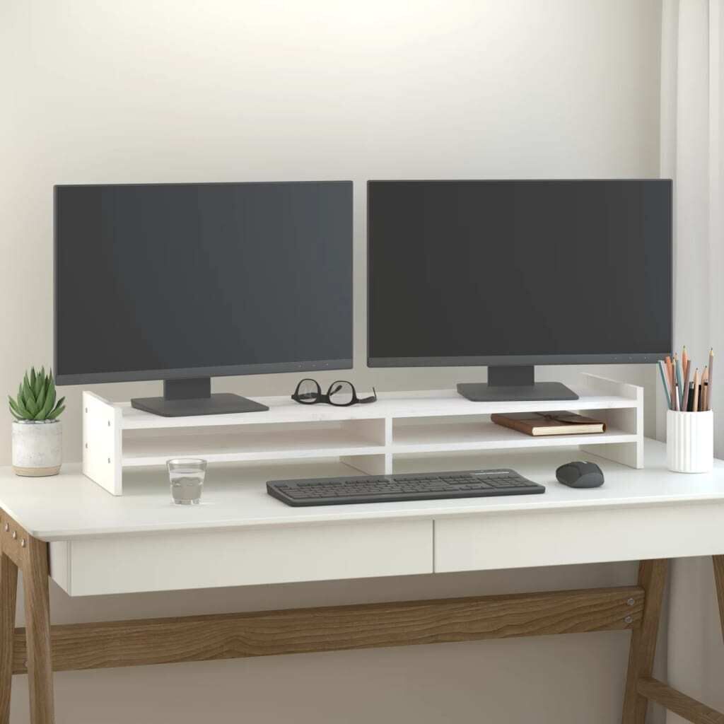$32.50This classic wooden monitor stand featuring a minimalist design adds a beautiful touch to your current living space. Solid pinewood: Solid pine wood is a beautiful natural material. Pine wood has a straight grain, and the knots give the material its signature, rustic look.Stable frame: The wooden frame of this computer stand ensures sturdiness and stability.Storage space: The space under the computer monitor stand can accommodate your keyboard, DVD player, gaming console, streaming device, receivers, media carriers, notebooks, pens, and similar items.Stress-reducing function: This keyboard stand can be used as a riser for your desktop monitor and other multimedia devices. Raising your screen will reduce the strain on your neck and back. Note:Each product comes with an assembly manual in the box for easy assembly.