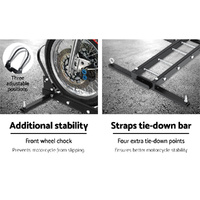 NOW $218.50Transport your motorcycle with confidence with the Giantz Motorcycle Carrier. With its 2'' hitch mount, the carrier is compatible with most hitch receivers. Featuring heavy-duty steel construction, the carrier can carry up to 227kg (500lbs) with minimum hassle. It is also designed to enable steady and firm transport with a close-fitting front tyre channel and front wheel chock. The front wheel chock can be adjusted with three available positions. It also comes with four extra tie-down points to better hold the motorcycle firmly in place while on the move. The loading ramp also enables easy up and down and be used either side. Not least, the carrier can also be used for cars with their tyres backed up onto the carrier.