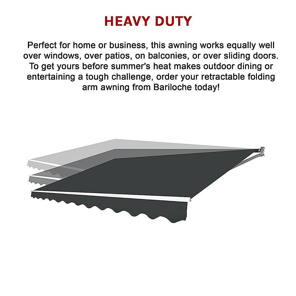 Perfect for home or business, this awning works equally well over windows, over patios, on balconies, or over sliding doors. To get yours before summer's heat makes outdoor dining or entertaining a tough challenge, order your retractable folding arm awning from Bariloche today!