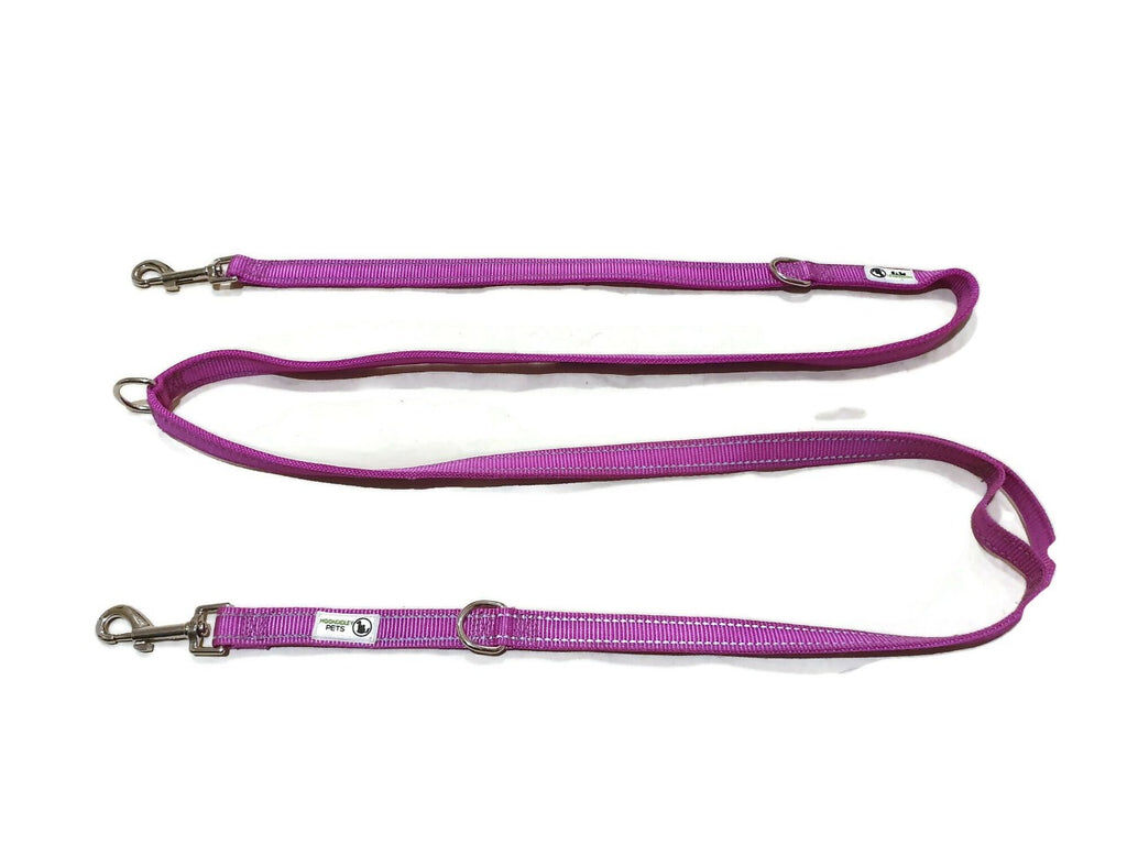 Multi Dog Lead - Nylon w/Reflective Stitching - Double Clip ,Coupler, Waist Belt, Short/Long, Quicktie - Moondidley Pets 25mm Purple