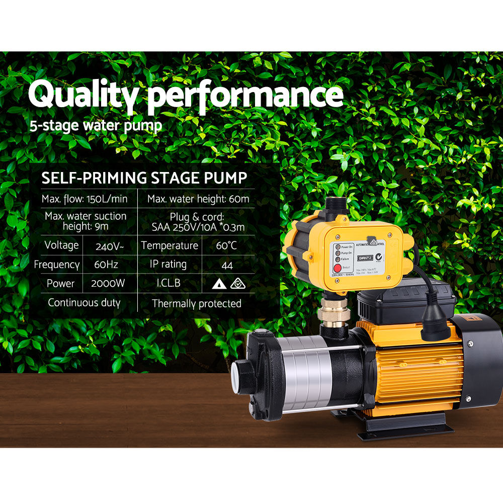 $278.95When low water pressure gets you down, power it up with our Giantz 5-stage Water Pump. It is the perfect solution where constant on-demand water pressure is needed at the open and close of any tap. You will find our water pump particularly useful for homes, household gardens, farms, commercial entities or any situation where pressurised water is consistently required. The water pump features an IP-rated commercial motor, full stainless steel pump body, cast iron ends, 1.25'' inlet and 1'' outlet ports, corrosion-resistant brass connectors, efficient cooling system and not least, built-in thermal protection. Pumping out at a rate of 150L/min with a 60m head, the 2000W water pump can send water up to two stories high effortlessly. You can also accurately control the pressure to your precise requirements with the fully automatic controller and monitor it at a glance of the pressure gauge. Power to the pump is as simple as plugging it straight into any Australian standard socket. Whether you are using the pump as a permanent installation or on an ad hoc basis, you can be assured of dependable and reliable water supply in more ways than one.