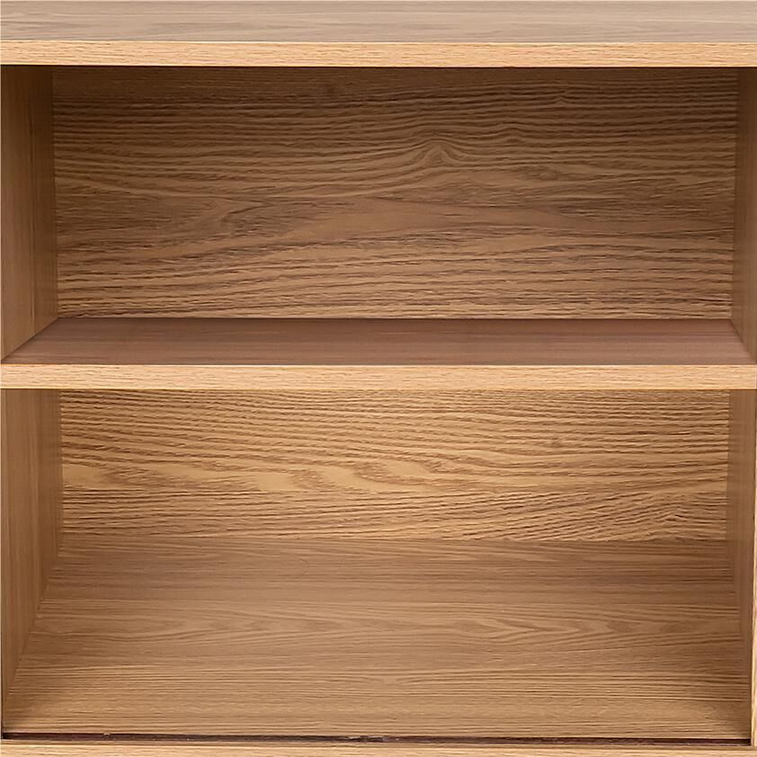 Its top is very spacious. The wooden texture on the desktop highlights its warmth and naturalness even more. It has two built-in shelves for ample space for storing items.