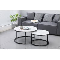 $414.77The Nesting Style Coffee Table in White on Black is a stylish and functional piece of furniture that features a white marble top with a black metal frame. The table comes in two sizes, with the smaller table fitting neatly underneath the larger one to save space when not in use. Each marble top finish might vary in pattern, making each piece unique.