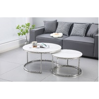 $497.54The Nesting Style Coffee Table in White on Silver Stainless Steel is a stylish and functional piece of furniture that features a white marble top with a stainless steel frame finished in silver. The table comes in two sizes, with the smaller table fitting neatly underneath the larger one to save space when not in use. Each marble top finish might vary in pattern, making each piece unique.