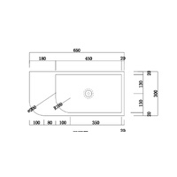 650mm x 300x200mm No tap/faucet mount No overflow Domestic, commercial, and hotel use Can be wall hung or bench top mounted Chrome pop-up plug drain included