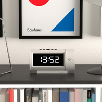 The unique Pil alarm clock design incorporates a 12 or 24-hour time display, a digital alarm and snooze function, and a temperature display.