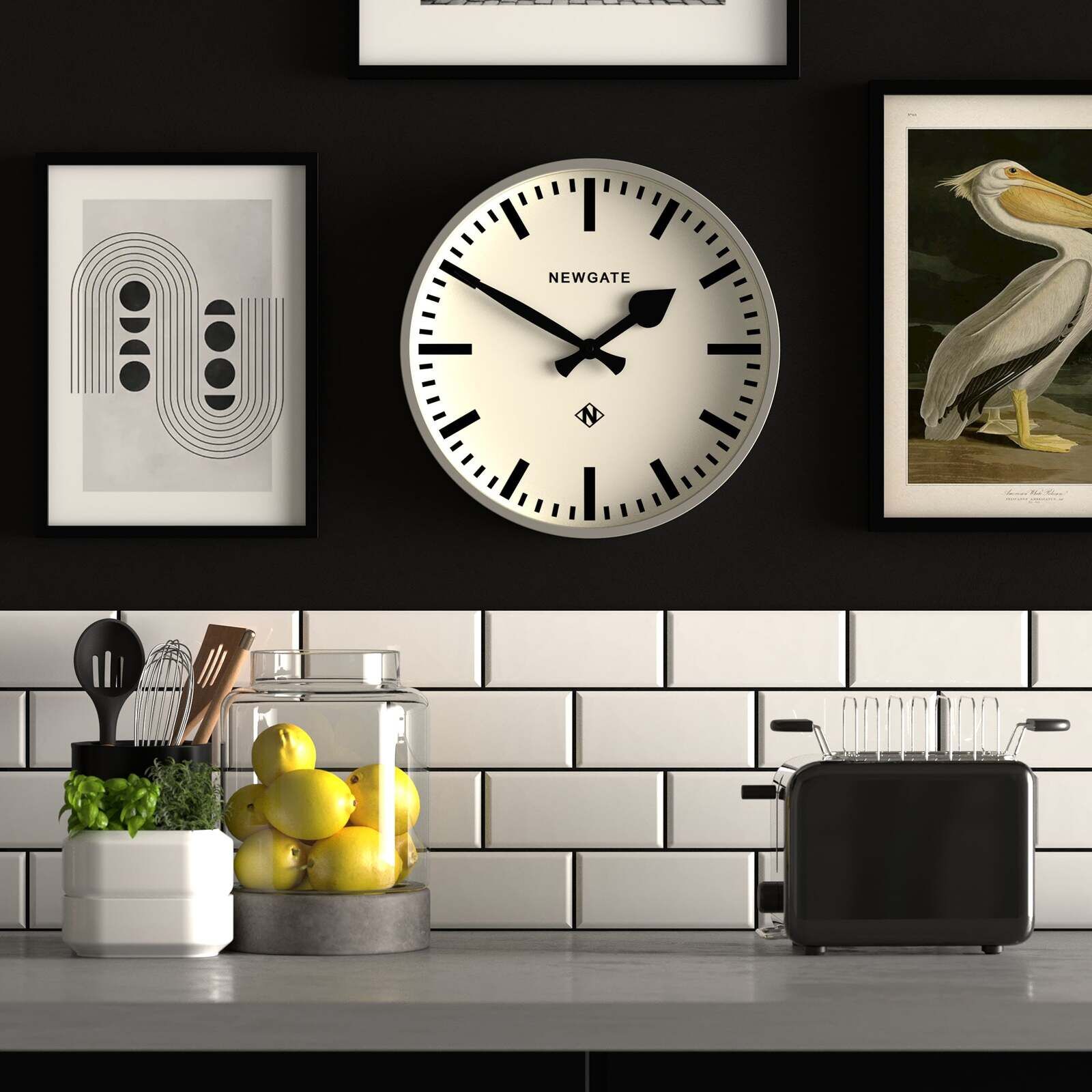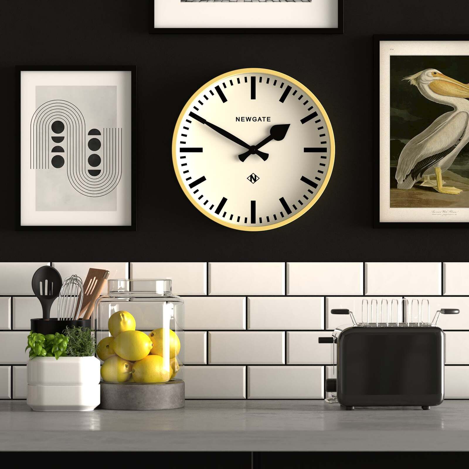 $97.64Newgate Railway Clock Yellow A bright yellow station wall clock with a bold marker dial, black spade and batton hands and a minimalist straight-cut case. A colourful wall clock is the ideal way to brighten up a room, whether that's the kitchen, living room or office.
