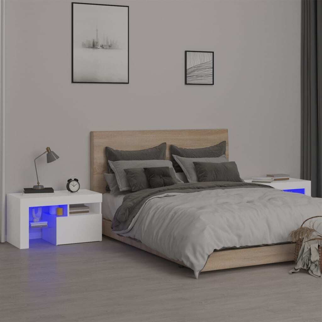 $159.29Anchor your living space in contemporary charm with these elegant bedside cabinets! Featuring a trendy yet practical design, these bedside cabinets with LED lights definitely become a focal point of your room. Durable material: The engineered wood is of exceptional quality with smooth surface and also features strength, stability and resistance to moisture. Colorful LED lights: The cabinet features RGB LED lights, which has different menus to change the colour of lights and let the colour adjust automatically differently. The LED lights underline the modern look and contribute to the trendy feeling.Ample storage space: The bedside table provides plenty of storage space for keeping your magazines, books, remote controls and other small items well-organised and within easy reach.Displaying function: The sturdy top of side cabinet is ideal for displaying decorative objects, photo frames, or potted plants. Note:This has a USB connector and the USB adapter is not included.Each product comes with an assembly manual in the box for easy assembly.