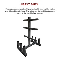The rack accommodates Olympic-sized 51mm weight plates and 50mm Olympic bars. There is room for multiple plates on each of six weight plate spokes. Even better, six additional outside spokes give you a convenient place to store standard-sized gym bars.