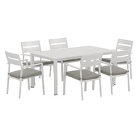 NOW $682.57Bring friends and family together with the new 6-seater Outdoor Dining Set from Gardeon. With six stylish dining chairs surrounding a generous dining table, theres room for everyone to enjoy an outdoor dinner or luncheon. Made with a powder-coated aluminium frame and topped with 6cm thick cushions, the set is strong and durable perfect for withstanding outdoor weather. The cushion covers are UV and water-resistant, and they can be removed for easy cleaning. Remove the cushions entirely to match the season. The smooth surface and slatted design make the table easy to clean and maintain. The classic design is perfect for backyards of all kinds, making it the ideal dining set for all your indoor and outdoor entertainment needs. Make the most of your time outdoors with the Gardeon 6-seater Outdoor Dining Set.