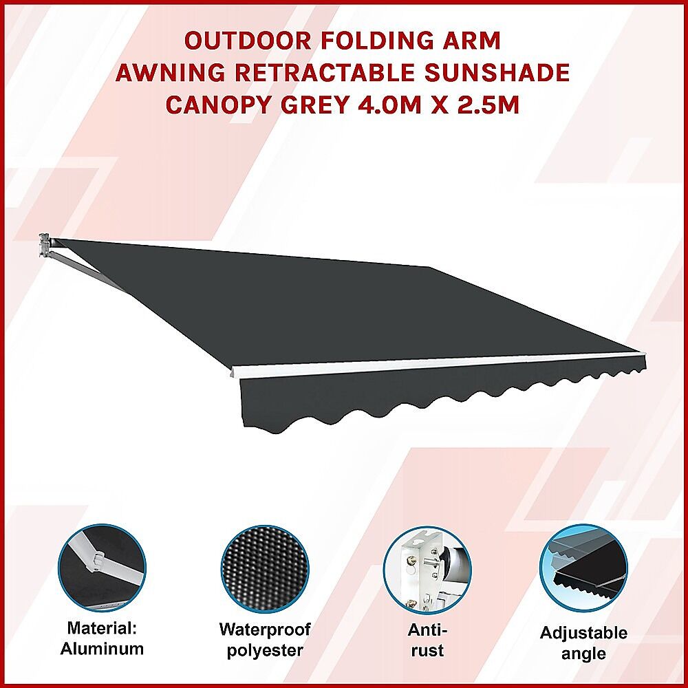 $487.79With summer just around the corner, it's time to start preparing your home to handle scorching heat and the sun's incessant rays. Bariloche's 4.0 m x 2.5m folding arm outdoor retractable awning is just the thing to protect you from the hot summer sun. Since it folds up easily with only the turn of a hand crank when you don't need its protection, you can retract it when you want more sunshine. Wall brackets make for easy installation, yet we do recommend you use a professional installer to make sure the installation is done right.