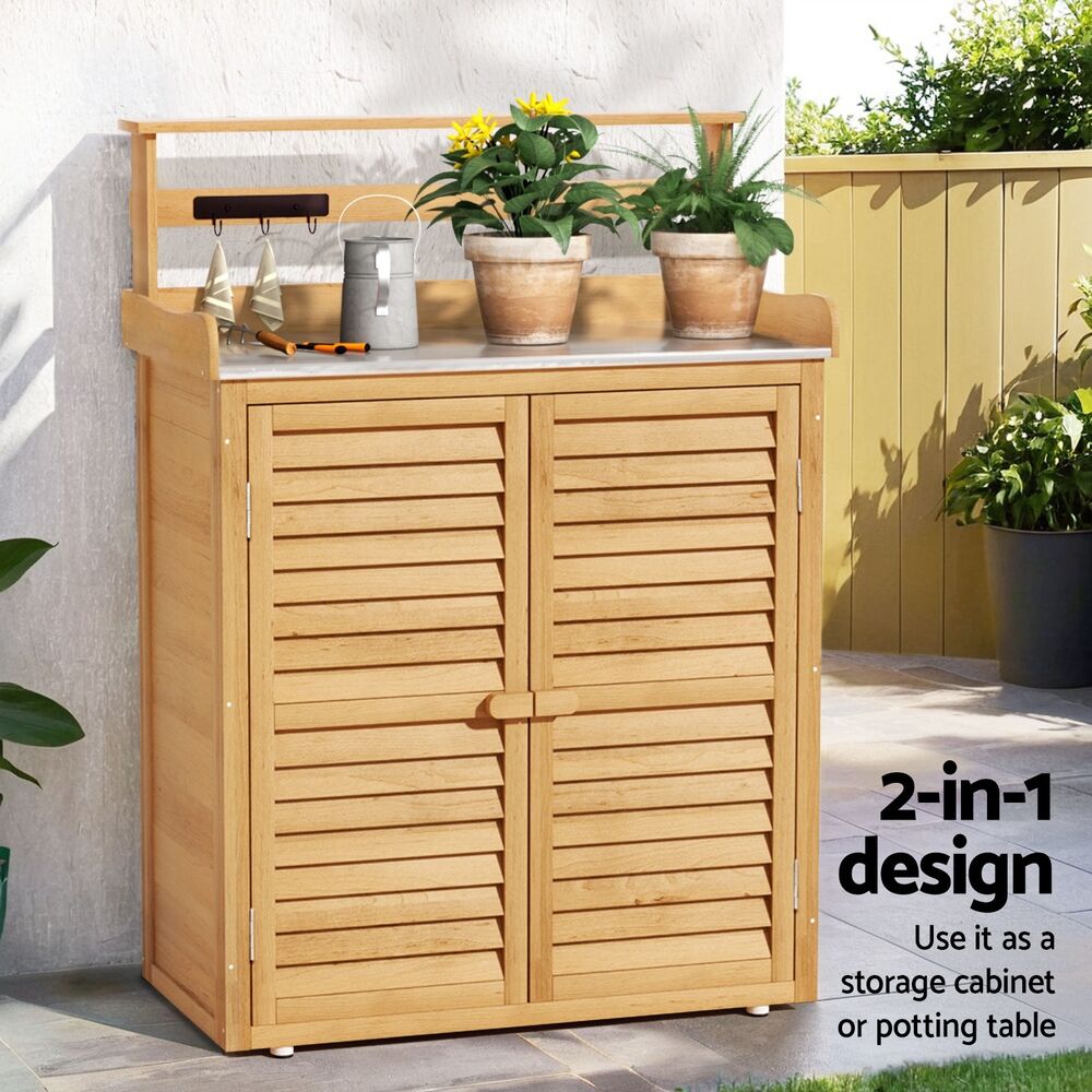 $177.62For stylish and practical outdoor furniture that can withstand any weather, look no further than the Gardeon Wooden Storage Cabinet. The 2-in-1 design is perfect for gardeners who are always on the go. The cabinet is made from solid Fir wood and features a built-in galvanized steel workbench, 3 tiers of shelving and 6 convenient hangers for all your gardening needs. Its weather-resistant structure will keep it standing through any kind of weather. Two magnetic latched doors will keep all your goods safe and sound away from the elements and backyard fauna. Use indoors or outdoors for unique rustic appeal. Easy to assemble and even easier to use, youll love the convenience and style of the Gardeon Wooden Storage Cabinet.