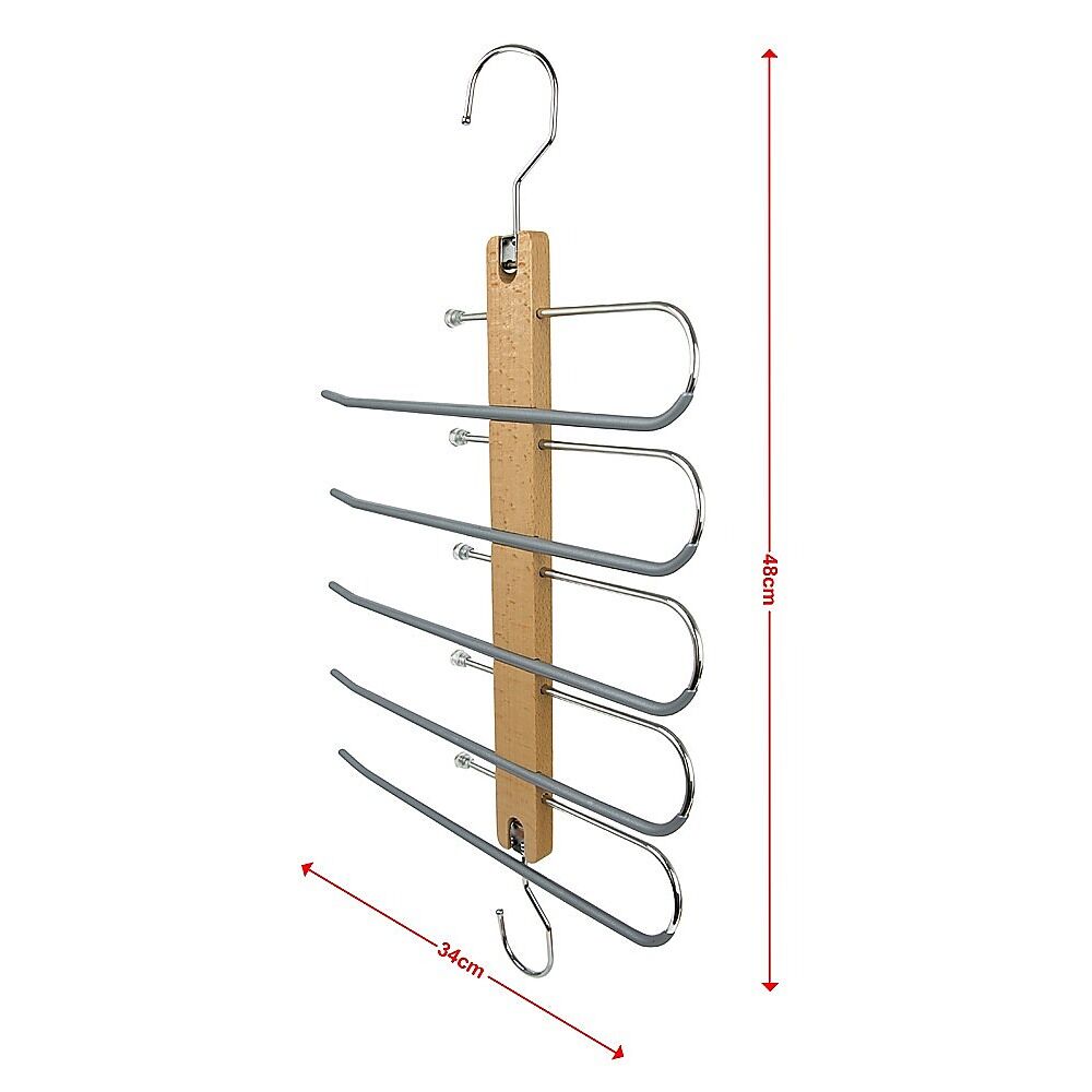 Organise your wardrobe in style with these natural wood, handcrafted hangers. Smooth enough to avoid splinters yet with enough grip to keep your pants from slipping off, these hangers give your wardrobe a uniform, elegant look. With their streamlined, uber-modern lines, they give your wardrobe's interior a designer look. With their rotating hooks, they're easy to hang. Each hanger accommodates five pairs of pants, so you can store your whole pants collection with only a few hangers. Save space and give your wardrobe a makeover. Order your hangers today!