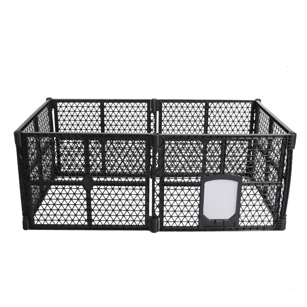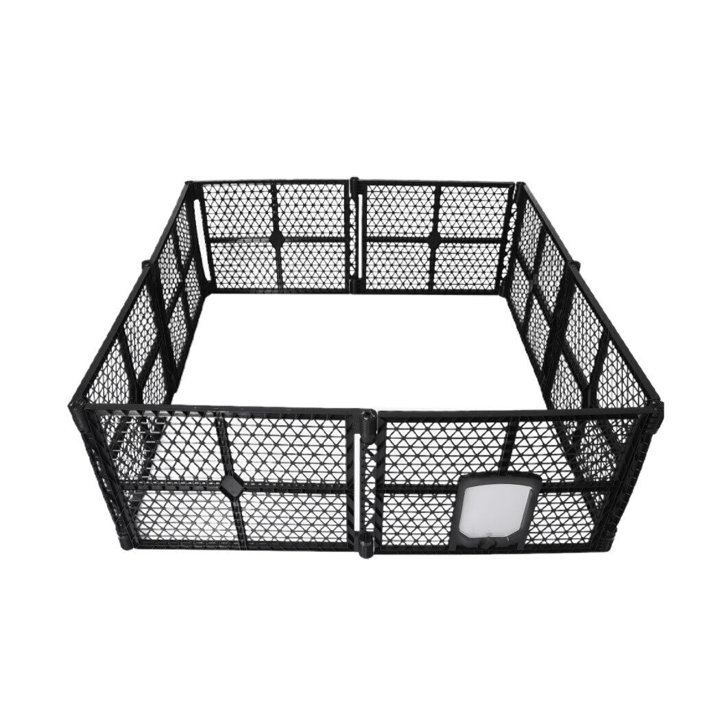 Happy dog. Happy life. Your dog will love their dog playpen. Set them up indoors or create a run for them outside. Place and shape it exactly how you want it. Safe and friendly for your pet.Your puppies doggos rabbits guinea pigs and more will love their pet playpen. Need more space? Buy another and just connect it together. Let your pet out via the dog flap or lock the flap in place.Pack your outdoor dog pen in your trailer and head off into the great outdoors. Set up a safe spot for your dog at your campsite. Do that again and again with your durable pet pen.Just came back from a long camping trip. Mud happens. Wipe it down or grab the hose. Just let it dry where it is. Cleaning is fast. Spend all that time saved doing the things you love.Small pets. Big pets. Red pets. Black pets. Your new pet playpen will suit many pets. Put your dog’s bed in there a water bowl some food and toys. They will love their new home. Get the 4 6 or 8 panel version according to your needs.